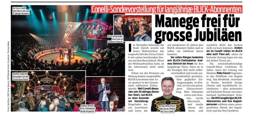 Conny-Land, ein Freitag im Frühherbst, die Sonne lacht. Als Frithjof «Fritzi» Gasser (59), Gaston Häni (66) und Roli Noirjean (42) zum Interview eintreffen, verändert sich die etwas verschlafene Stimmung im an diesem Tag geschlossenen Vergnügungspark schlagartig: Mitarbeitende des Parks kommen vorbei und begrüssen die drei Clowns überschwänglich, manche kennen sich seit Jahren, man hat viele Saisons gemeinsam erlebt. Fritzi und Gaston waren schon in den ersten Tagen des von Conny Gasser vor 35 Jahren gegründeten Zirkus dabei, und Roli gehört ebenfalls schon seit 20 Jahren zum Zirkus. Die drei Clowns und der Weihnachtszirkus Conelli sind so untrennbar miteinander verknüpft, dass Fritzi, Gaston und Roli eine Anstellung auf Lebenszeit erhalten haben.